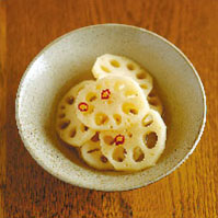 熊本特産のレンコンをサッと茹でて、熊本伝統の赤酒を使った特製ビネガーに漬け込んだ、まろやかな味わいのピクルスです。レンコンのシャキシャキッとした歯ごたえをお楽しみください。前菜やもう一品欲しいときに。ワインやシャンパンにもよく合います。