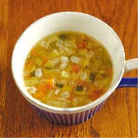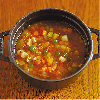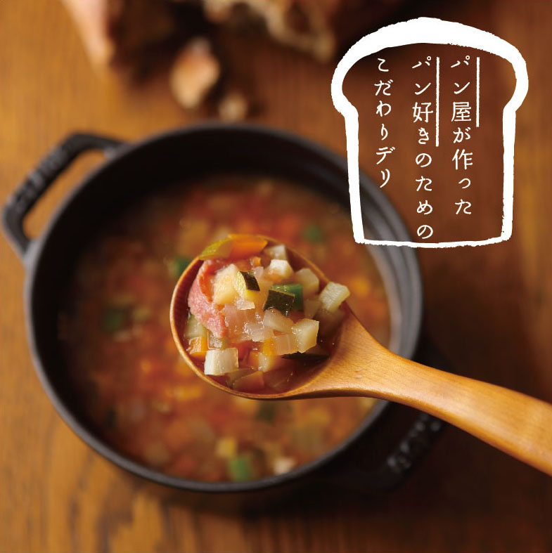 熊本産の季節の野菜とベーコンを、ブイヨンで仕上げたトマト風味の具だくさんスープです。野菜の旨みがスープに溶け込み、栄養も抜群。これにパンさえあれば、おなかいっぱいになりそうな食べるスープです。お夜食や小腹が空いた時にもぴったり!